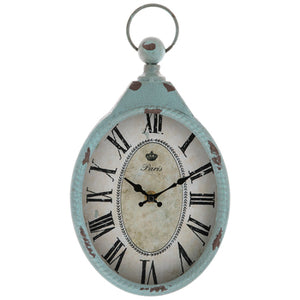 Looking for a functional, beautiful piece for your home or office? Look no further than Distressed Blue Oval Metal Wall Clock! This gorgeous metal clock with MDF elements features a distressed aqua blue finish, an antiqued clock face with roman numeral markings, the word "Paris" and a crown in the center oval, a plexiglass cover, and a loop detail at the top. Place this stunning clock on the wall of your office, home library or living room for an instant dose of vintage charm!