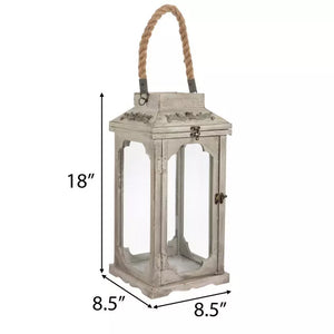 Cast your living room or entryway in lovely light by displaying this Antique White Wood Lantern. This charming lantern features a tall body with a distressed white finish. These walls support glass panels and a tall door you can open to insert an LED candle. Dimensional flourishes decorate the roof while a thick jute handle ties the look together. Make sure your home has stylish vintage flair with this lantern!.