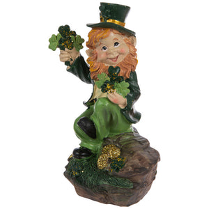 Invite a cute leprechaun into your home with this Leprechaun Holding Shamrocks! This delightful resin statuette features a cheery leprechaun resting on a rock with his hands full of shamrocks and glittery gold coins at his feet. Set it out on a table or mantel for a bit of springtime luck!