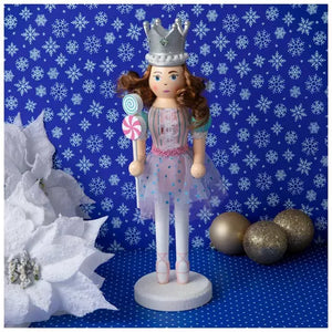 Add a sweet touch to your seasonal display by decorating your home with this Candy Fairy Princess Nutcracker. This fairy princess is wearing a pastel dress with a polka dot skirt and striped blouse. It is embellished with woven trim and sheer ribbons on the front tied into bows. She stands on a round base coated in iridescent glitter and holds a peppermint wand in her hand. With a silver crown, curly brown hair, and a beautiful face, this proper princess is ready to celebrate Christmas with you!