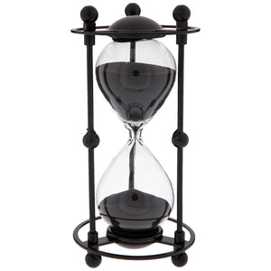 Count down in style! Hourglass With Metal Frame features black sand inside a glass hourglass. This glass is protected by a black metal frame with a circle on the top and bottom and three metal supports. This gorgeous frame is symmetrical, so it will look the same no matter which side you use!