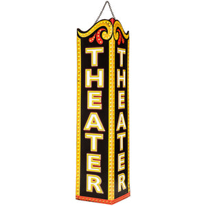 Get nostalgic with your decor! This Theater Triangle Embossed Tin Sign features shades of black, white, yellow and red and is designed to look like an old-fashioned theater sign. The triangle shape makes the sign project from the wall, adding even more interest! Display it on the wall of your entertainment room or movie room for an instant touch of vintage flair.